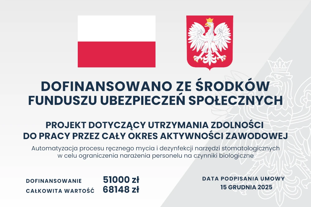 Realizacja powyższego projektu pozwoli wyposażyć stanowisko pracy asystentki stomatologicznej i higienistki stomatologicznej w urządzenie, które zautomatyzuje proces mycia i dezynfekcji narzędzi stomatologicznych, co przyczyni się do zredukowania niekorzystnego oddziaływania czyn.biologicznych, a dzięki temu wprowadzone zmiany pozwolą ograniczyć szkodliwy wpływ procesu pracy na zdrowie pracowników tj. zmniejszy się ryzyko zawodowe związane z narażeniem na czynniki biologiczne ze średniego do małego, co zostanie potwierdzone poprzez wykonanie ocen ryzyka zawodowego. W przypadku dekontaminacji ręcznej procesy są czasochłonne i niejednokrotnie obarczone błędami. Dekontaminacja maszynowa zabezpiecza personel przed zakłuciami niosącymi ze sobą ryzyko ekspozycyjne, zapewnia niezawodność i jakość procesu, dodatkowo nie narażając skóry pracownika oraz dróg oddechowych na kontakt z środkami chemicznymi. Przez automatyzację wyeliminowany zostanie proces ręcznego mycia i dezynfekcji ostrymi narzędzi, a dzięki możliwości wkładania skażonych narzędzi bezpośrednio po zabiegach do wkładów kompatybilnych z myjnią eliminuje w całości eliminujemy kontakt dłoni pracownika z ostrymi narzędziami, pomiędzy procesem przenoszenia, mycia oraz procesem sterylizacji. Realizacja projektu pozwoli na zwiększenie skuteczności w zakresie prewencji zagrożeń i znacznie podniesie bezpieczeństwo pracy, co przełoży się na utrzymanie zdolności do pracy pracowników przez cały okres aktywności zawodowej